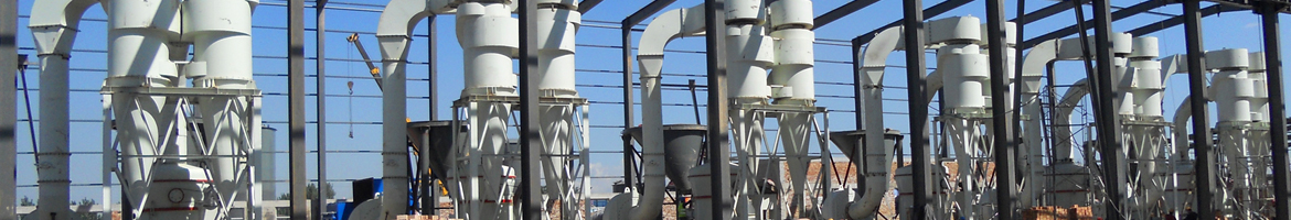 大塊物料經(jīng)顎式破碎機破碎到所需粒度后,由提升機送至儲料斗,再由皮帶機將物料均勻定量連續(xù)地送入6臺MTW175歐版磨的主機磨室內(nèi)進行研磨。粉磨后的物料被風機氣流送入選粉機進行分級,在選粉機葉輪的作用下,不符合細度要求的物料落入磨室內(nèi)重新碾磨,合格的物料則經(jīng)空氣斜槽進入旋風集粉器內(nèi),進行分離收集,經(jīng)排料裝置排出即為成品粉體。