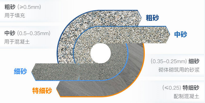 1、粗砂:我們機(jī)制山砂中,大概有50%沙子粒徑大于0.5mm,這些粒徑大于0.5mm的砂子被稱為粗砂,主要用于鋼筋混凝土、梁、板、柱、基礎(chǔ)、地坪的砼。