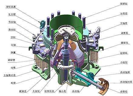 工作時,由電動機通過三角帶、大帶輪、傳動軸、小錐齒輪、大錐齒輪帶動偏心套旋轉(zhuǎn),破碎圓錐軸心線在偏心軸套的迫動下做旋轉(zhuǎn)擺動,使得破碎壁表面時而靠近又時而離開軋臼壁的表面,從而使物料在定錐與動錐組成的環(huán)形破碎腔內(nèi)不斷地受到?jīng)_擊、擠壓和彎曲而破碎。經(jīng)過多次擠壓、沖擊和彎曲后,物料破碎至要求粒度經(jīng)下部排出。